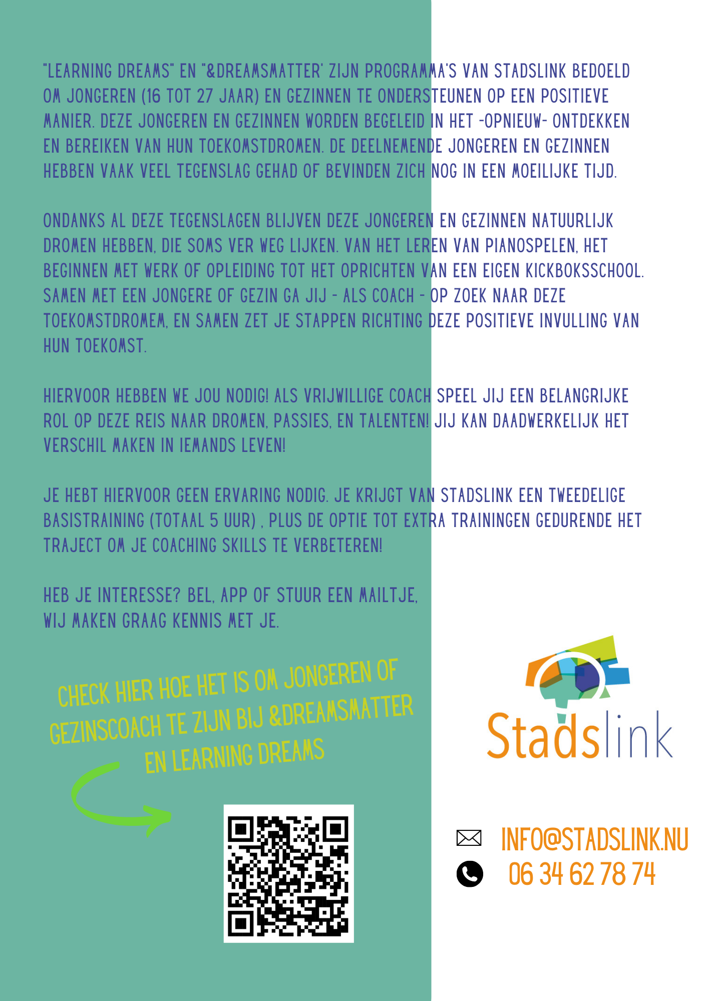 De jongeren hoeven dit niet geheel op eigen kracht te doen. We bouwen een steunsysteem om hen heen, door een vrijwillige of een professionele coach uit te stad te koppelen aan deze jongeren, die gelooft in de droom van de jongeren en die helpt bij het vormgeven van de droom. Samen worden er oplossingen in de stad gezocht die bijdragen aan het verwezenlijken van de droom. De community (wijk, stad en haar bewoners) wordt actief aangesproken om mee te denken en bij te dragen aan deze oplossingen. Op deze wijze ontstaan nieuwe positieve verbindingen rondom de jongeren van betrokken mensen uit de stad die aan zijn/haar droom bijdragen. Hoe ‘cool’ is dat: dat anderen positief betrokken zijn bij jouw droom en wensen!